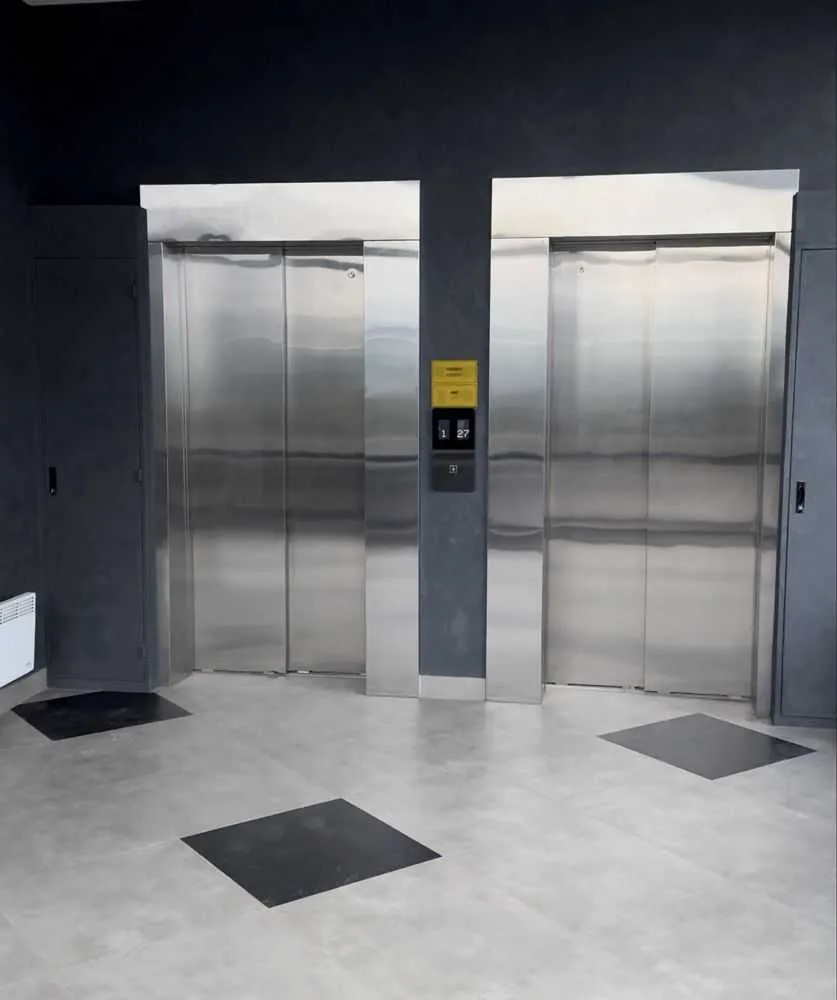 Ліфти — швидкісні, безшумні, з оздобленням з нержавіючої сталі, працюють стабільно. Освітлення у спільних зонах — енергоощадне, з датчиками руху. Чистота підтримується щоденною роботою клінінгу. Коридори широкі, з приємною атмосферою та сучасною навігацією.