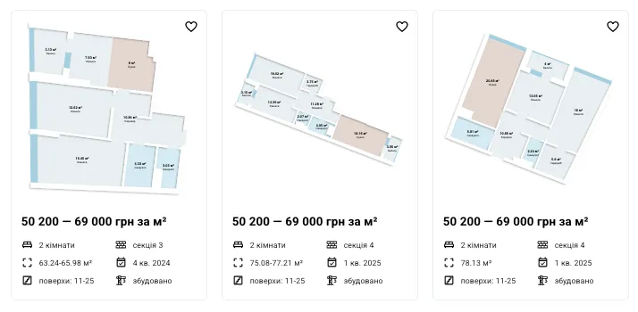 Двокімнатні: 63 - 78 м2 — 50 200 - 69 000 грн/м2