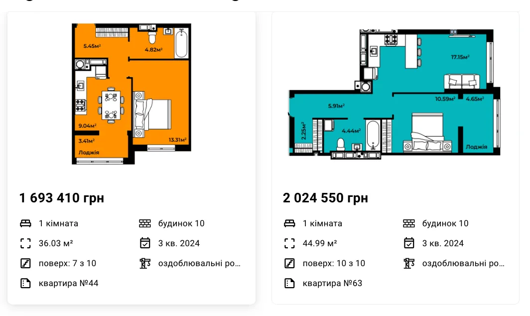 Однокімнатні: 36 - 45 м2 — 45 000 - 47 000 грн/м2