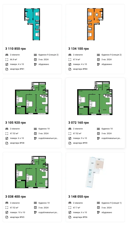 Двокімнатні: 67 - 68 м2 — 45 000 - 46 500 грн/м2