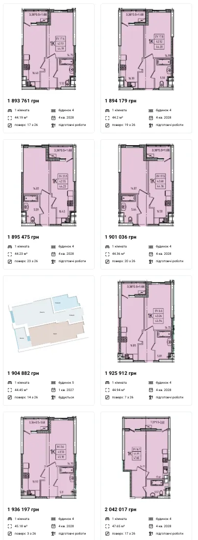 Однокімнатні: 28 - 48 м2 — 42 850 грн/м2