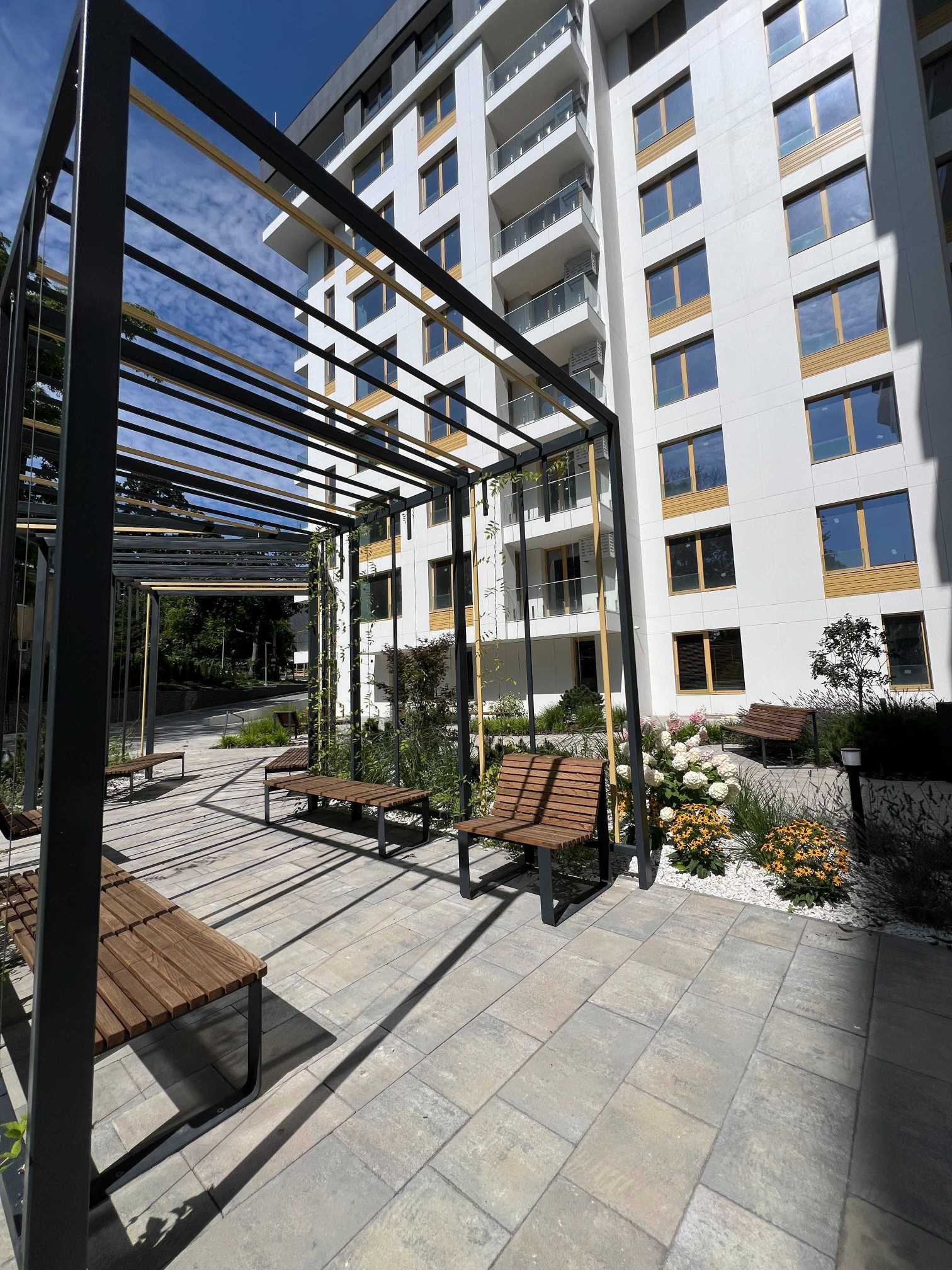 На подвір’ї передбачено мінімальне озеленення та кілька зон для відпочинку, однак великий упор зроблено саме на паркувальні місця. Дитячий майданчик є, але він компактний і більше підходить для наймолодших дітей.