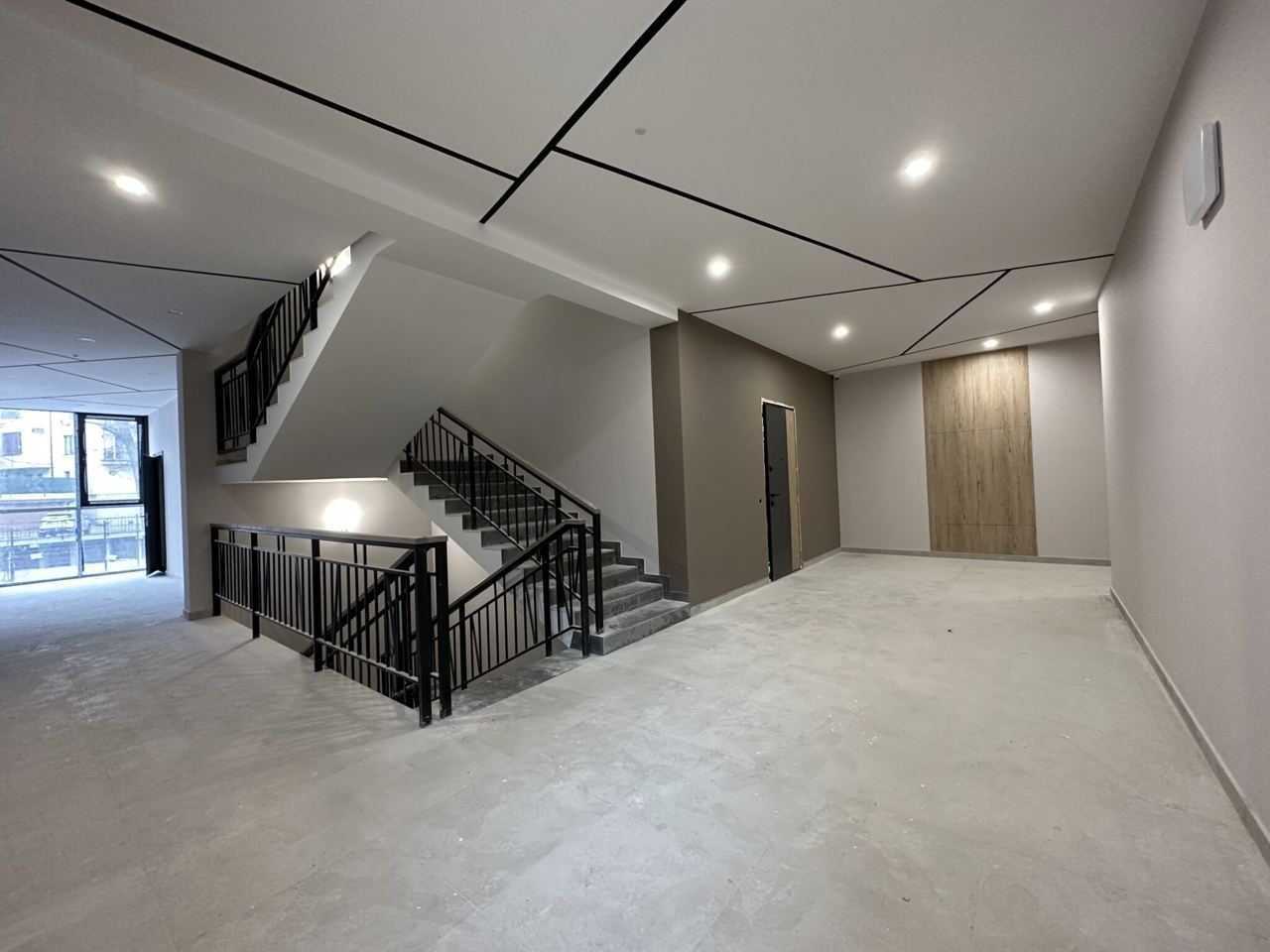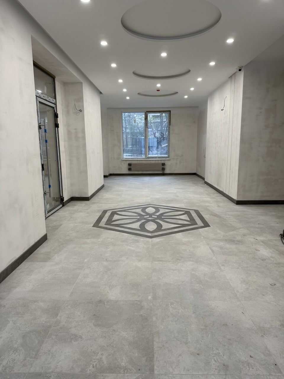 Хол невеликий, але світлий завдяки великим вікнам і використанню світлих відтінків в оздобленні. На підлозі плитка, яка добре витримує навантаження, стіни пофарбовані в нейтральні кольори. Ліфт сучасний, середнього розміру, підходить як для повсякденного використання, так і для перевезення габаритних речей.
