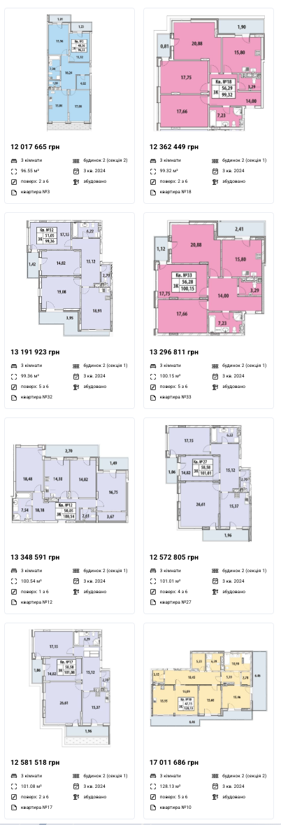 Трикімнатні: 97 - 128 м2 — 124 450 - 132 750 грн/м2