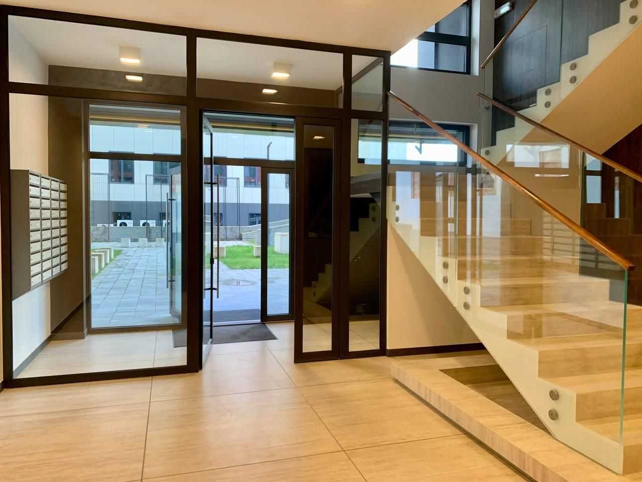 У вхідній зоні є дзеркала, місце для очікування та інформаційна панель, але без надлишкових декоративних елементів. Ліфт сучасний, малошумний, оздоблений у тих самих мінімалістичних тонах, що й інтер’єр холу. Загальні коридори чисті, з якісним покриттям підлоги та стриманим дизайном. Помітно, що забудовник робив ставку на практичність і довговічні матеріали, а не на декоративні ефекти.