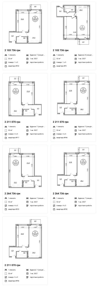 Однокімнатні: 42 - 52 м2