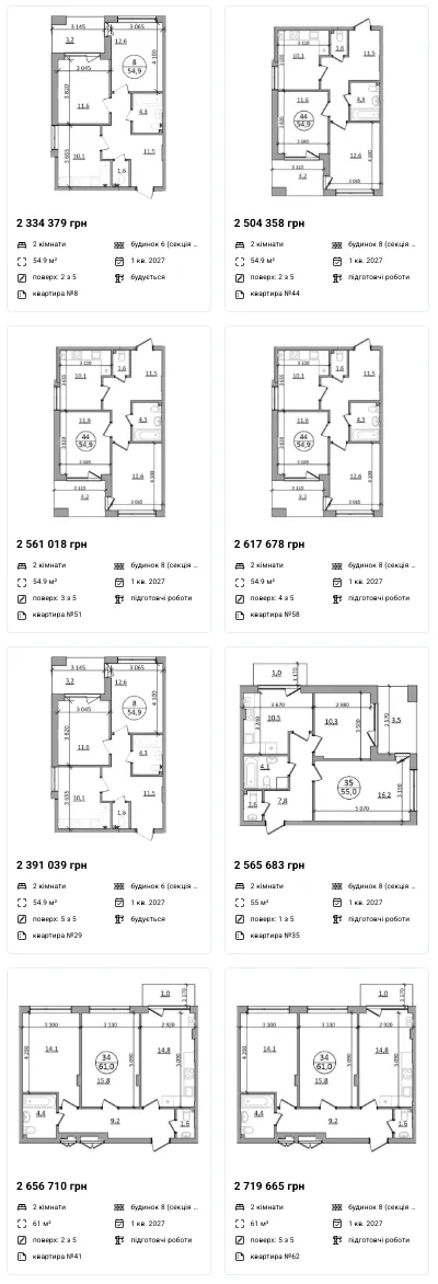Двокімнатні: 55 - 79 м2 — 40 650 - 45 850 грн/м2