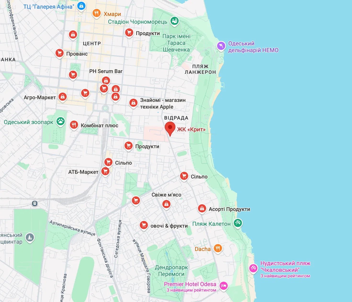Житловий комплекс Крит знаходиться за адресою бул. Французький 13а у Приморському районі Одеси.