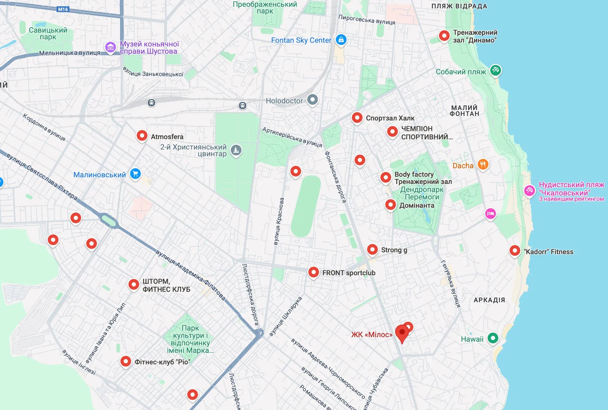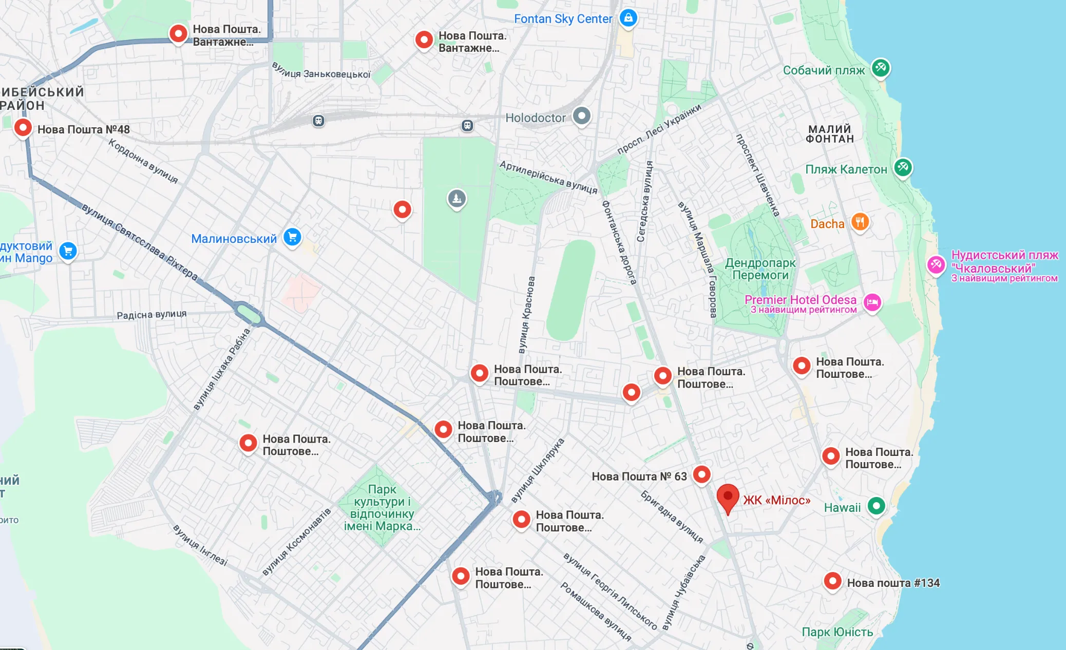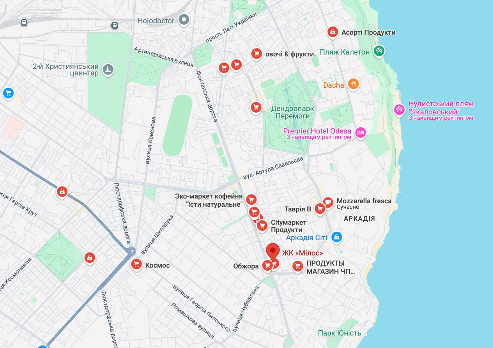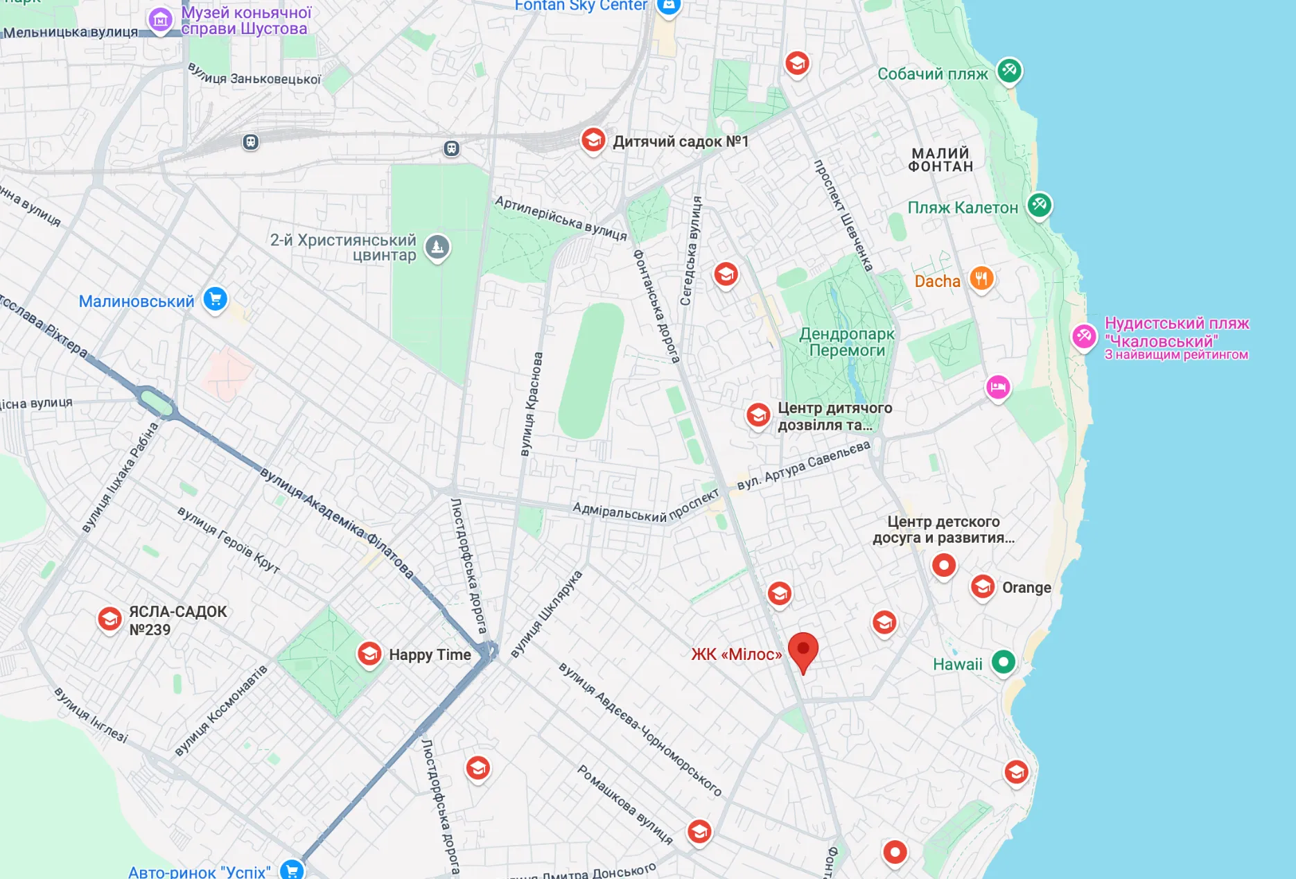 Житловий комплекс Мілос знаходиться за адресою пров. Полуничний 24 у Приморському районі Одеси.