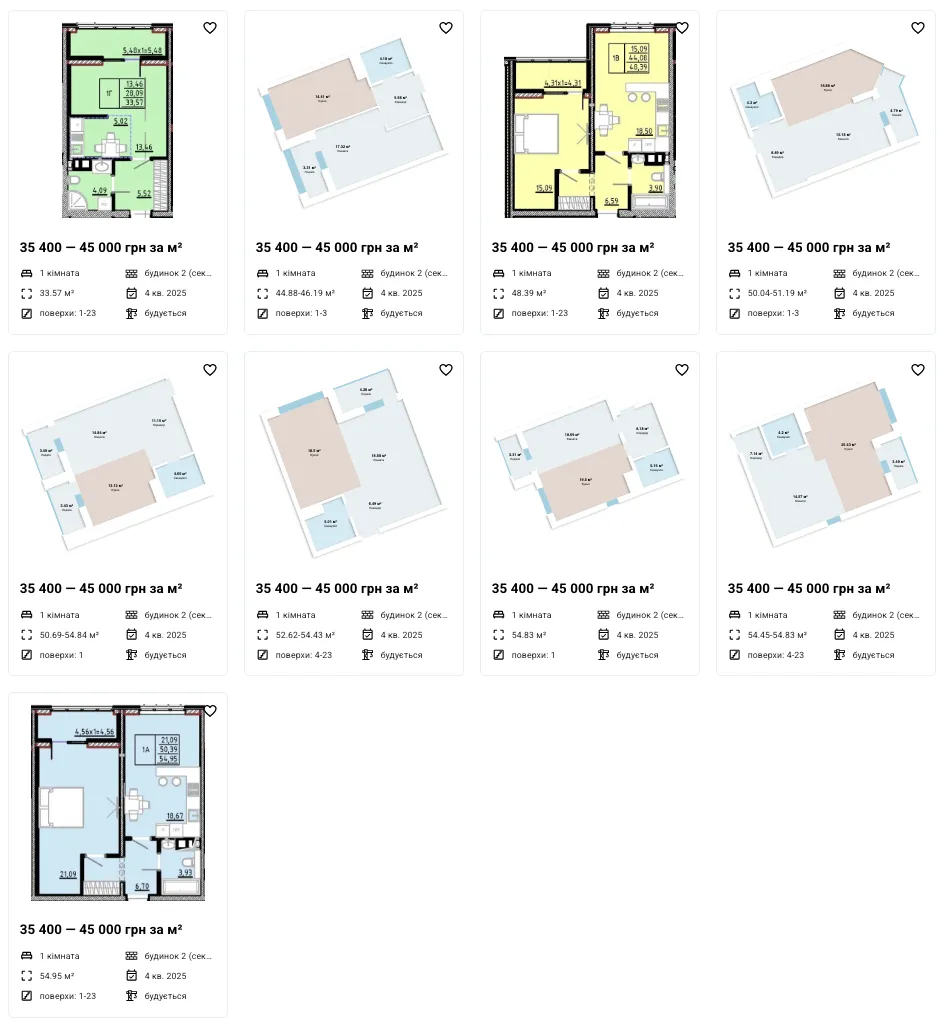 Однокімнатні: 34 - 55 м2 — 35 400 - 45 000 грн/м2