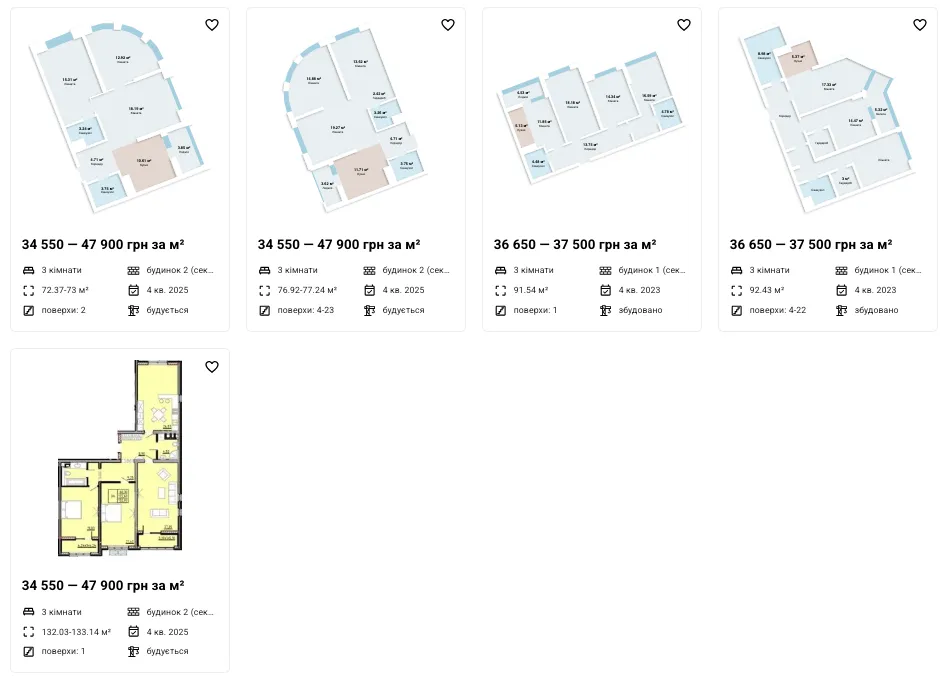 Трикімнатні: 73 - 133 м2 — 34 550 - 47 900 грн/м2