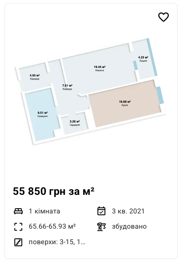 Однокімнатні: 66.2 м2 — 55 850 грн/м2