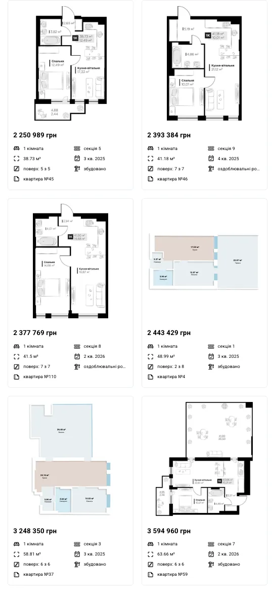 Однокімнатні: 36 - 64 м2 — 49 900 - 56 050 грн/м2