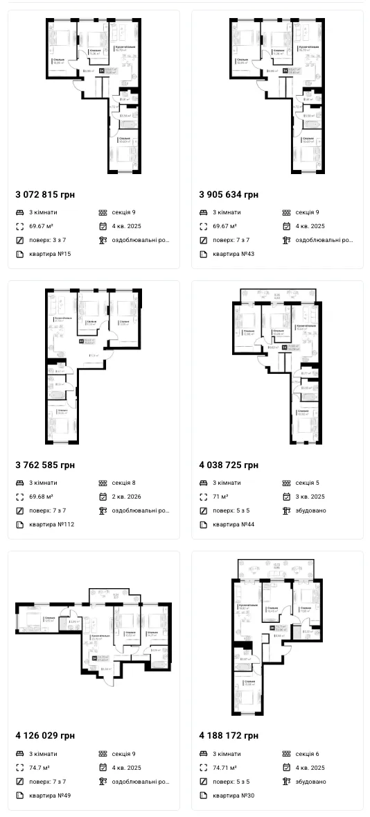Трикімнатні: 70 - 95 м2 — 39 350 - 51 250 грн/м2