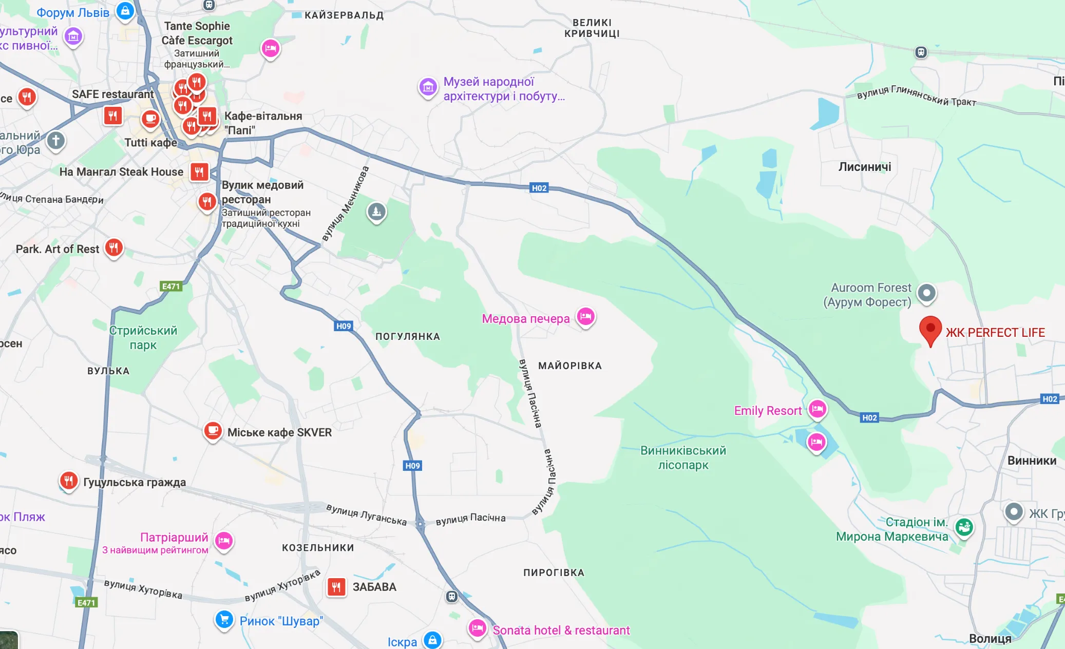 - Розташування: близько до природних зон, водночас за 20 хвилин автомобілем або 35 хвилин — громадським транспортом до центру Львова.