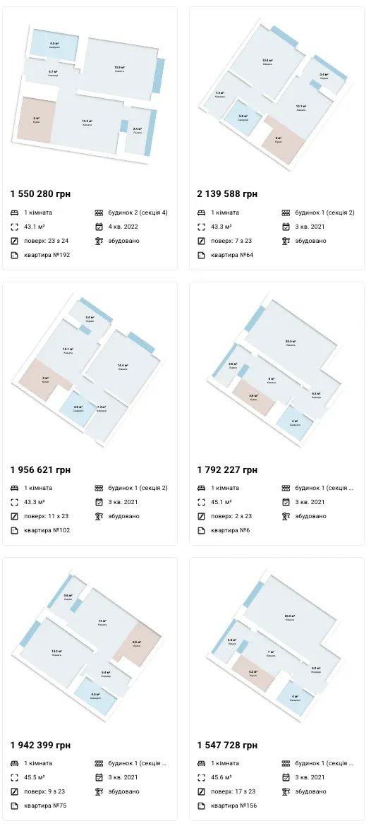 Однокімнатні: 35 448 - 61 950 грн/м2