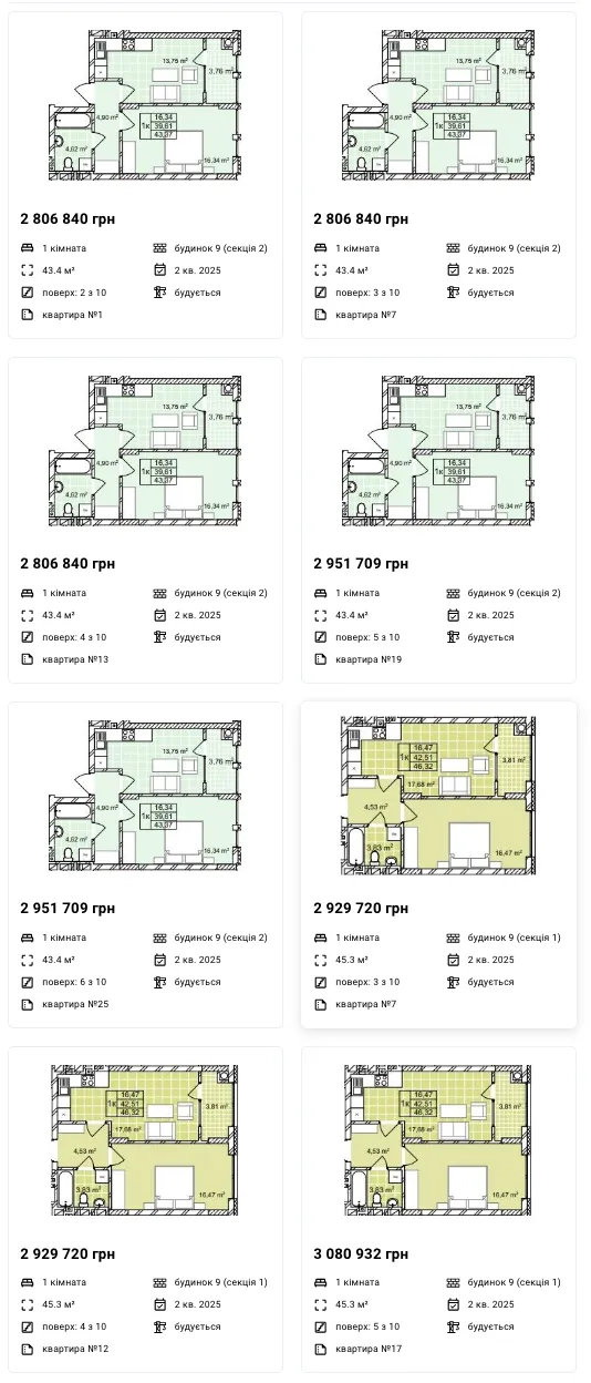 Однокімнатні: 41 - 54 м2 — 64 450 - 68 000 грн/м2