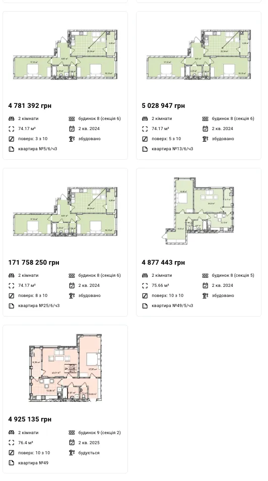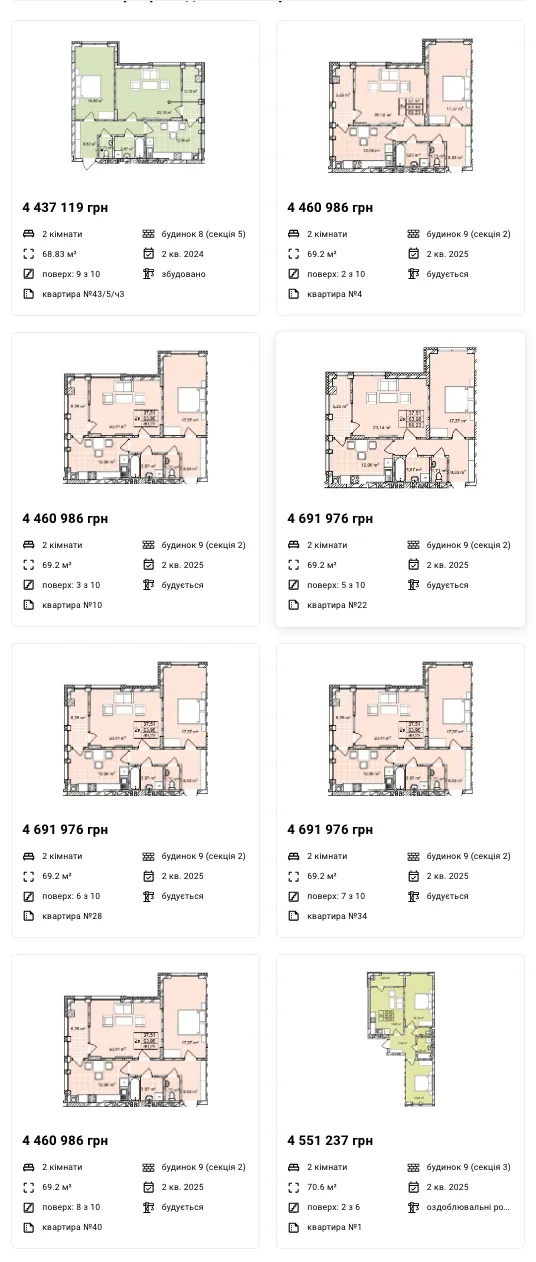 Двокімнатні: 69 - 76 м2 — 64 450 - 67 800 грн/м2