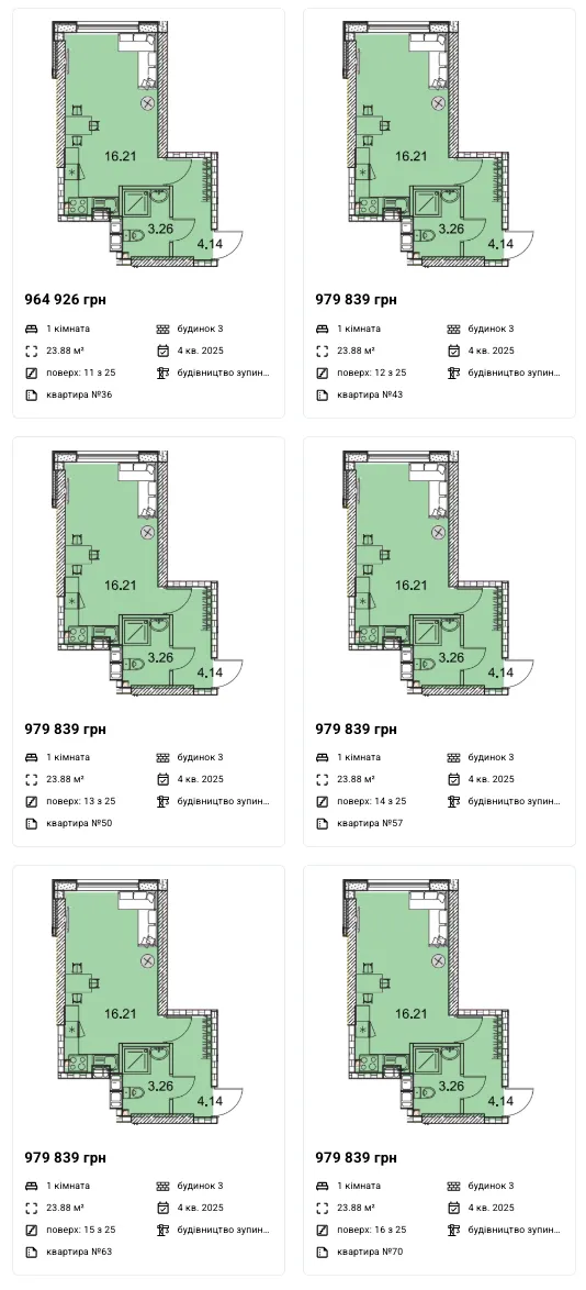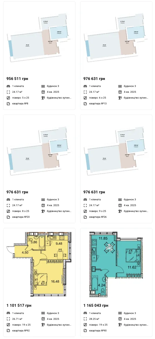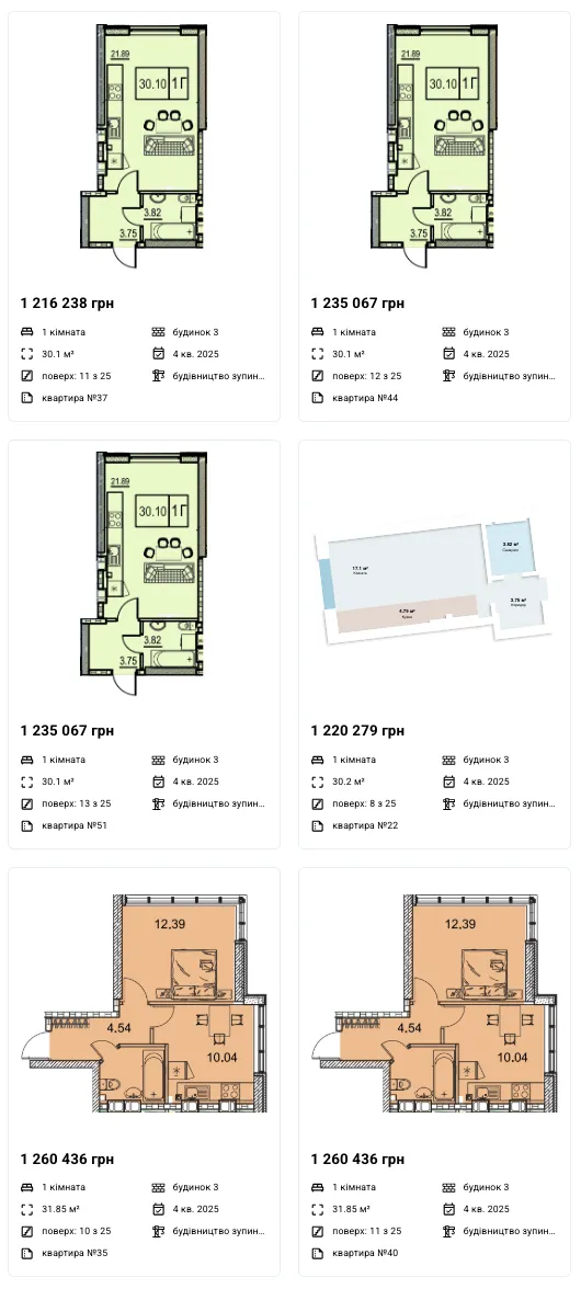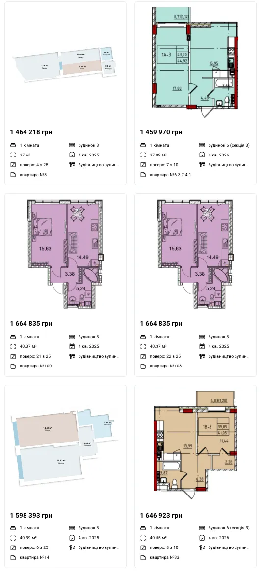 Однокімнатні: 24 - 52 м2 — 38 550 - 40 600 грн/м2