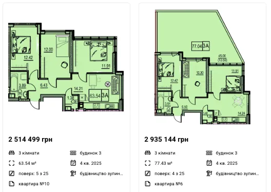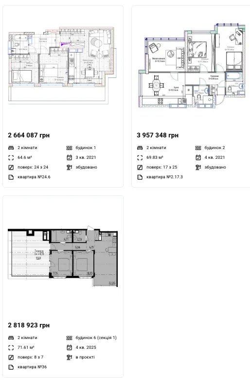 Трикімнатні: 64 - 77 м2 — 37 900 - 39 550 грн/м2