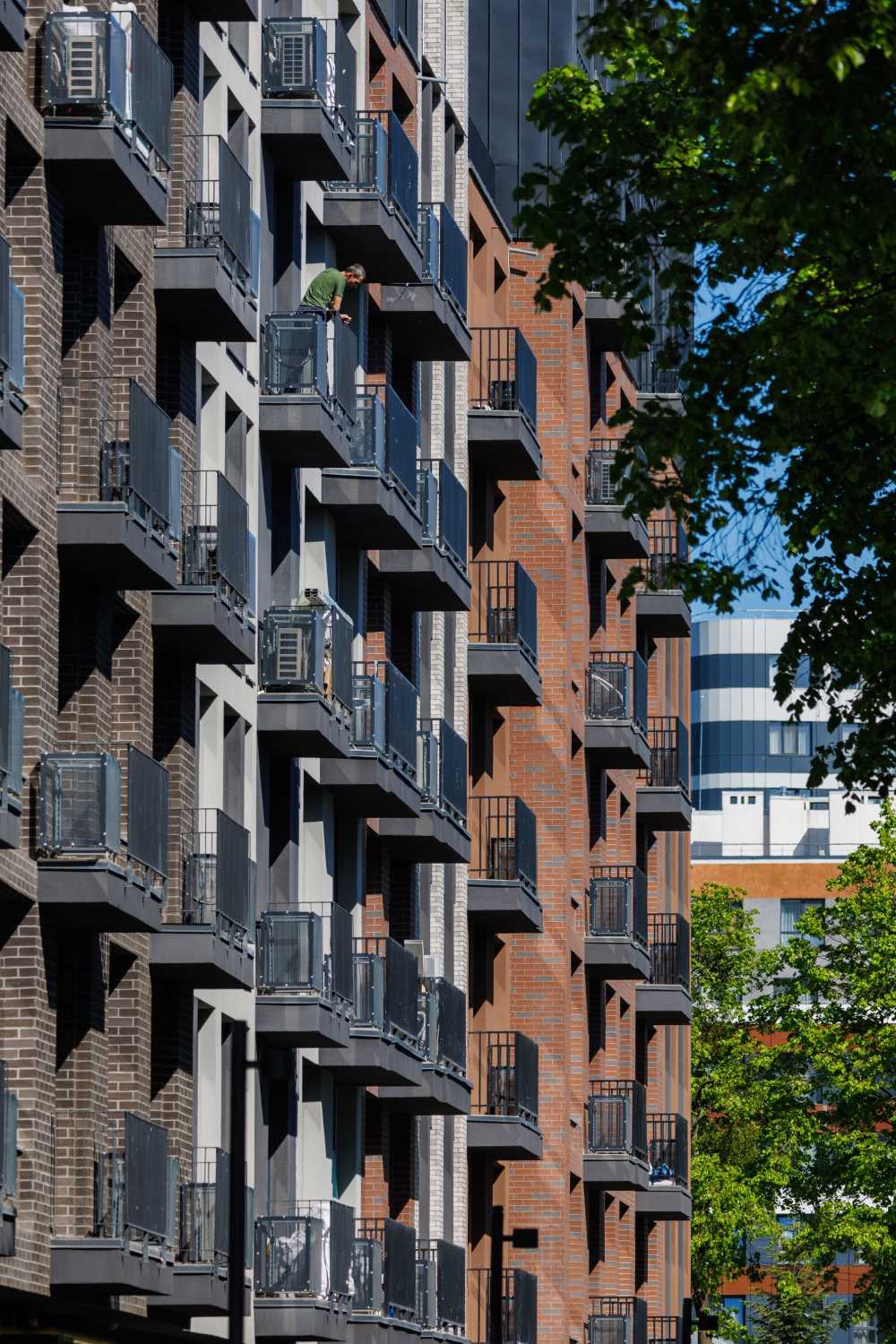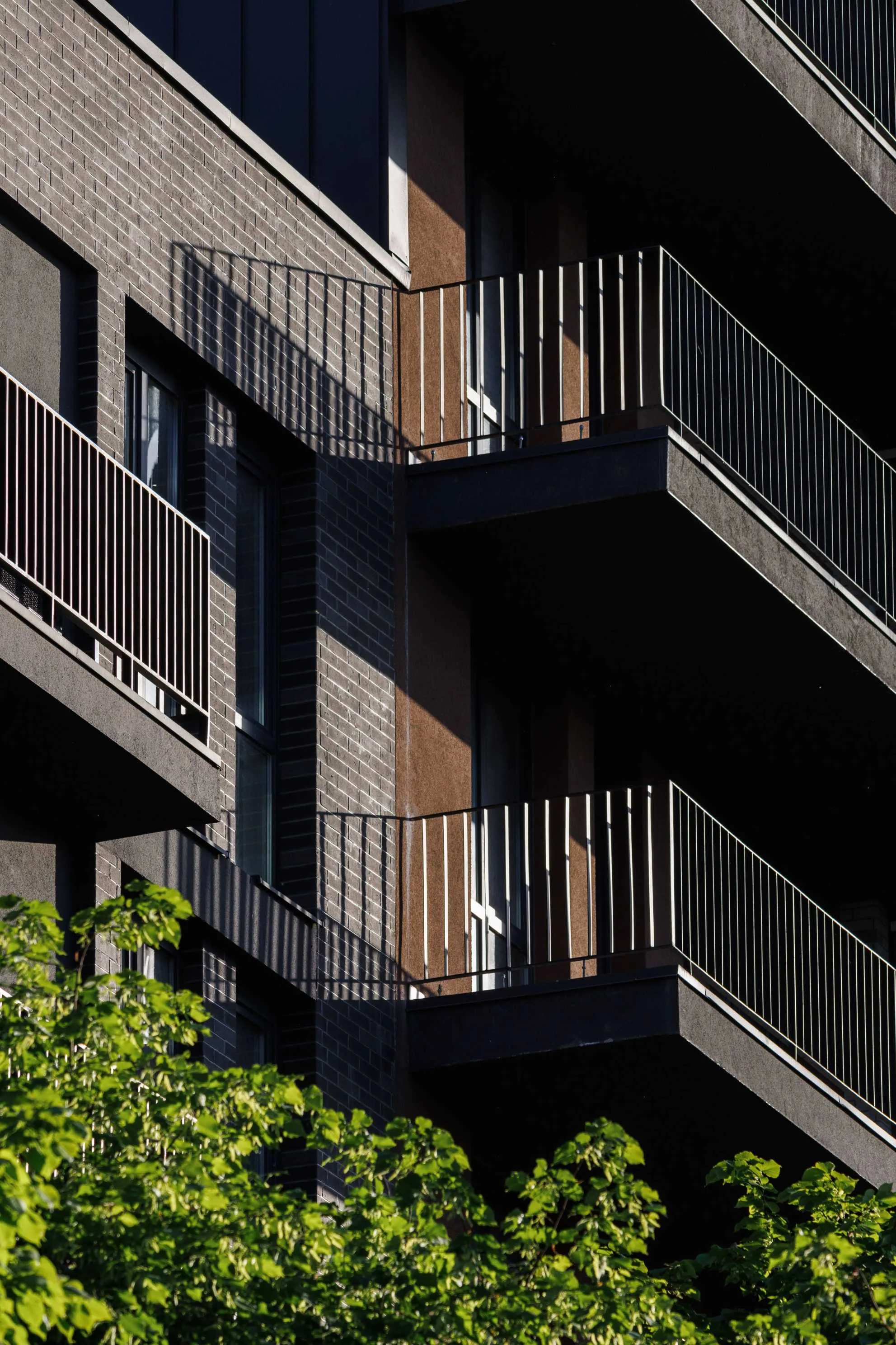На фасаді знаходяться корзини для кондиціонерів, що зберігає охайний вигляд при постійному заселенні нових мешканців.