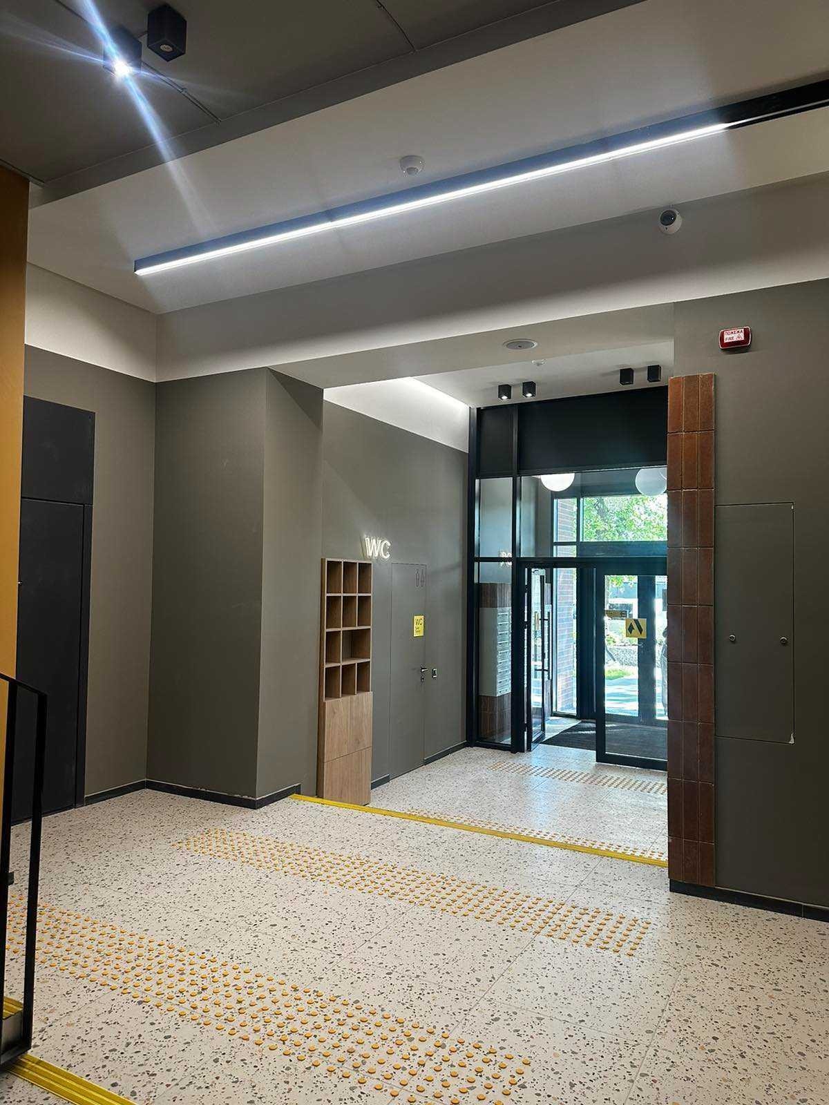 На підлозі зроблені позначки для людей із вадами зору, при вході є вбиральня та інші зручності. Це дійсно високий рівень, який зустрічається не в такій великій кількості житлових комплексів у Львові та інших містах України.