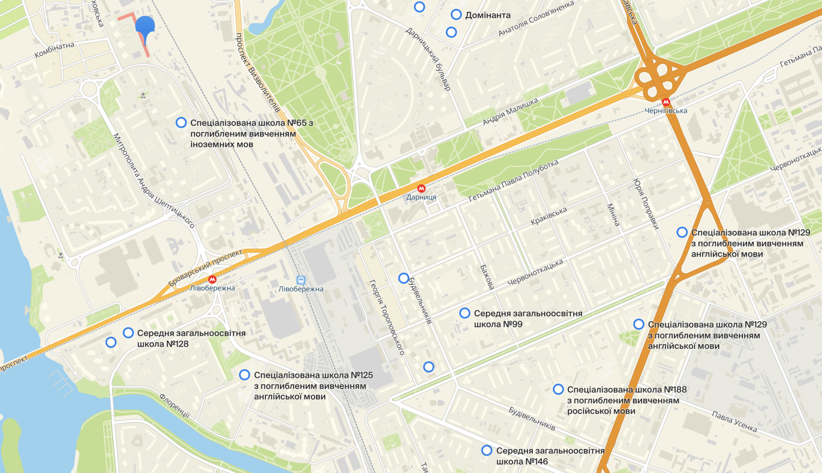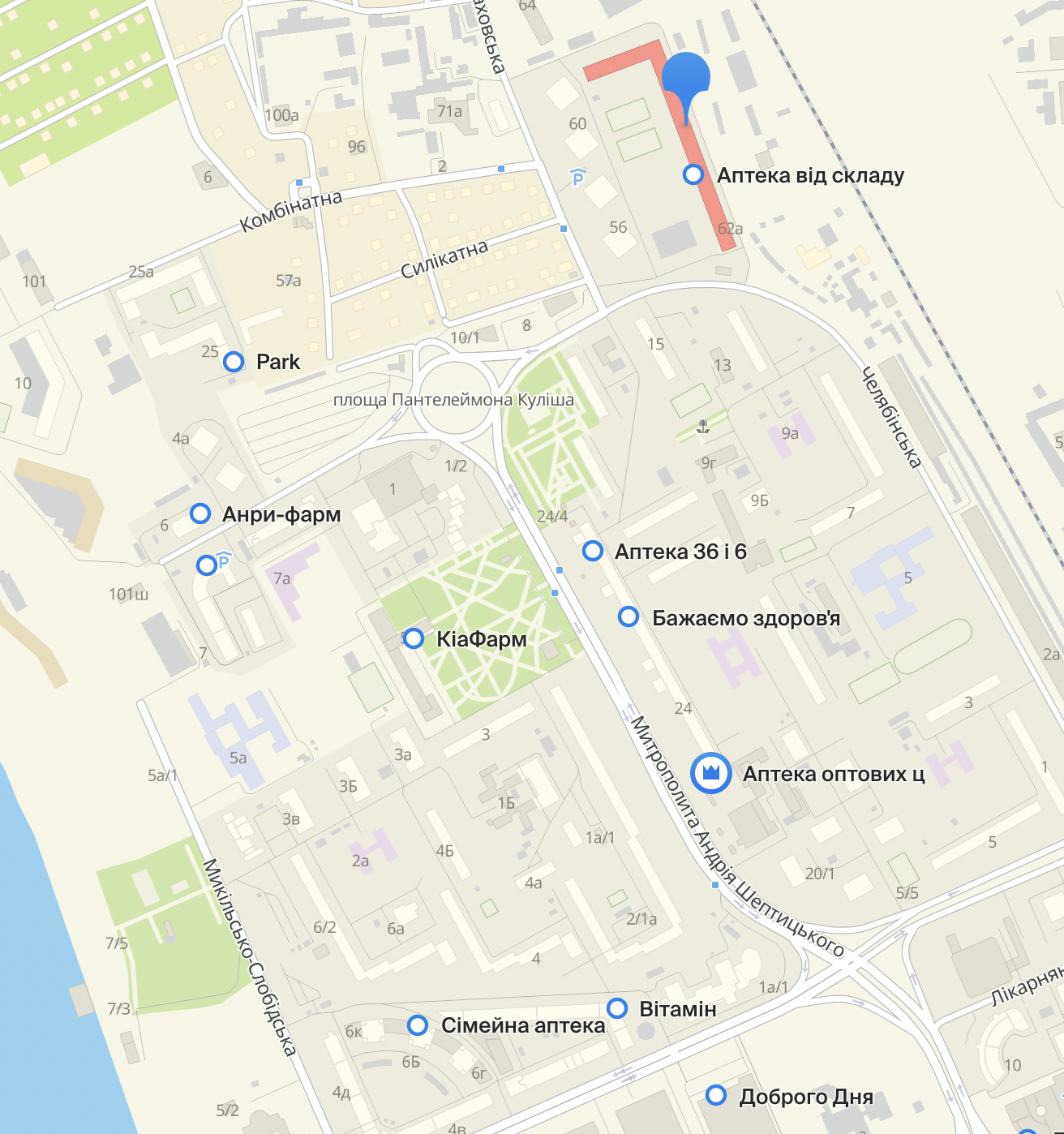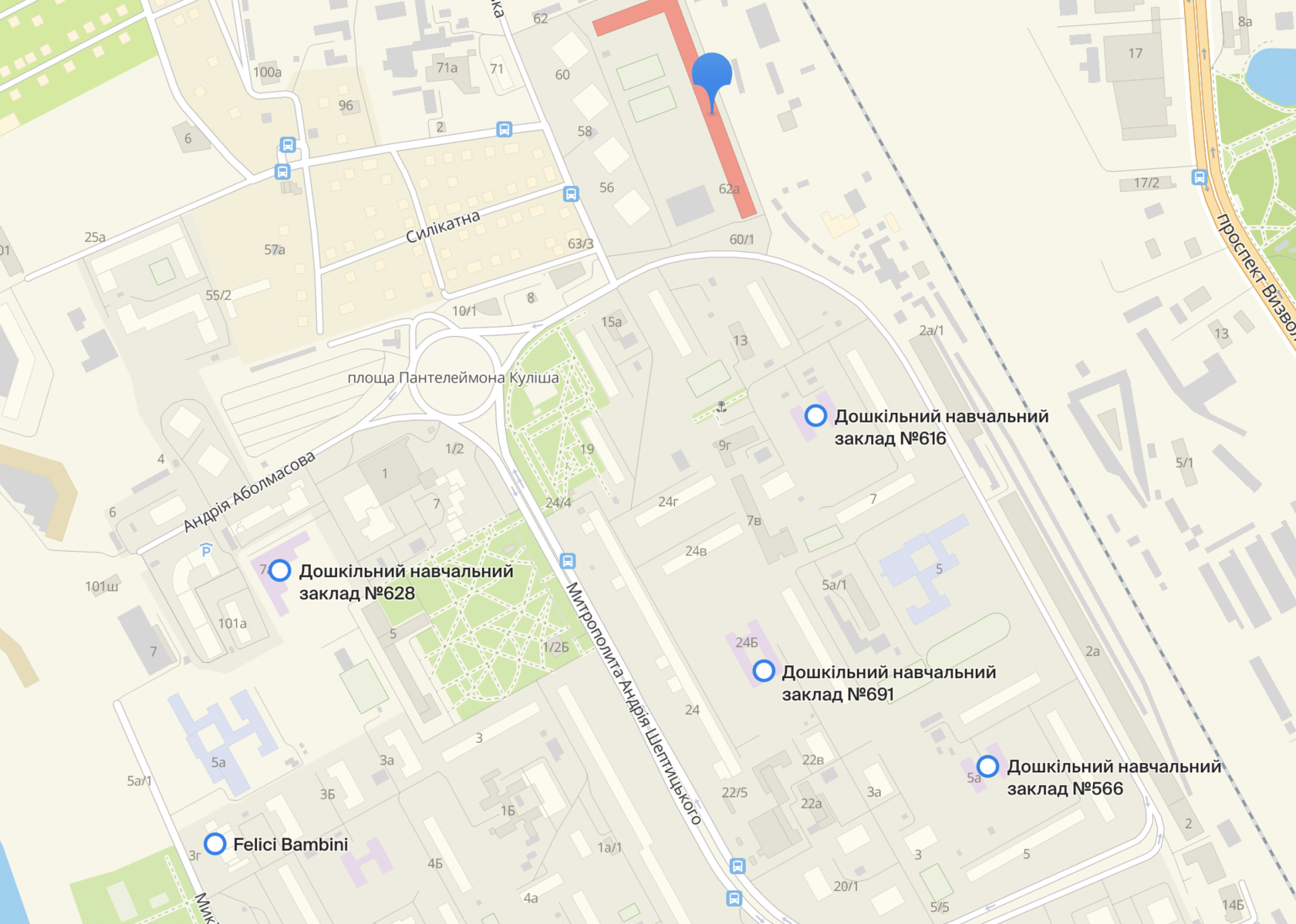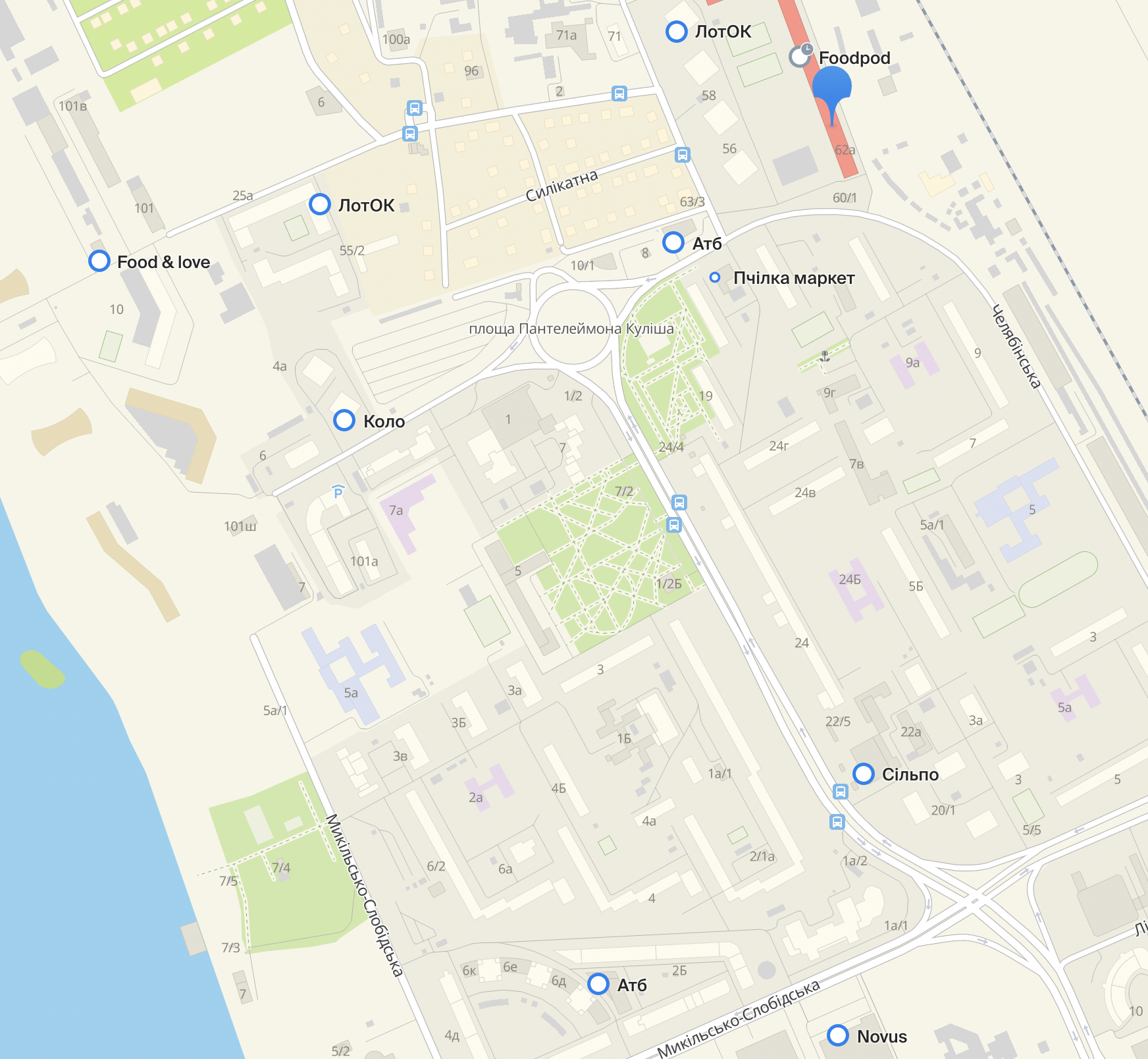 Продуктові магазини (в пішому доступі всі сітьові супермаркети АТБ, Сільпо та Новус)