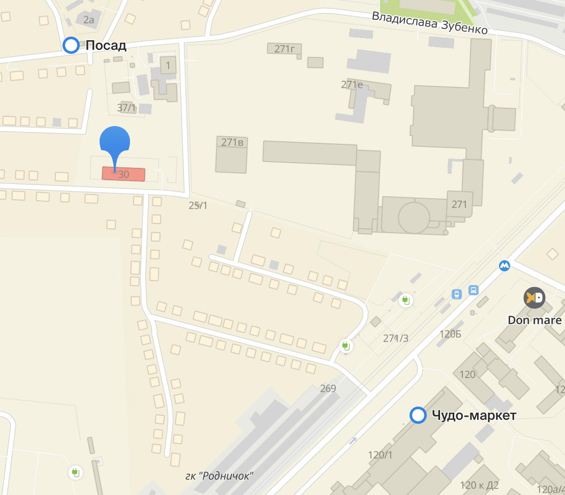 В округе есть два продуктовых магазина: небольшой Посад и полноценный супермаркет Чудомаркет в 10 минутах ходьбы.