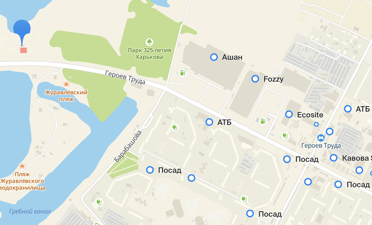 Продуктовые магазины находятся возле метро Героев Труда. В пешей доступности крупные торговые сети такие как Ашан и Фоззи.
