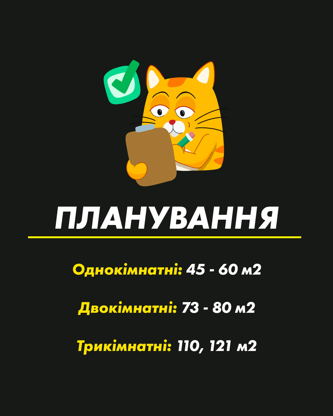 Досить невеликий вибір різних планувать, проте він є.Однокімнатні: 45- 60 м2